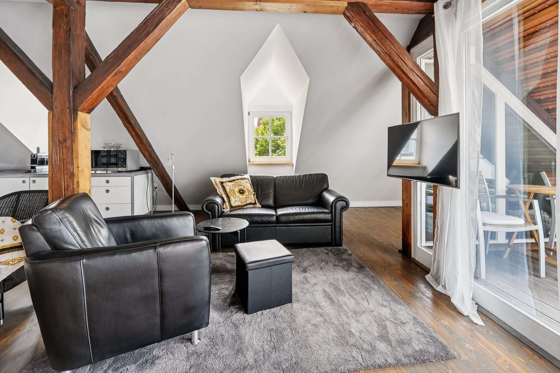 Im Ober- und Dachgeschoss (ca. 101,02 m²) befindet sich eine hochwertig ausgestattete Maisonettewohnung mit sonniger Dachterrasse und offenem Wohnkonzept. Die Einheit ist aktuell bis Ende Juli vermietet und eignet sich ideal zur Eigennutzung oder Weitervermietung.
