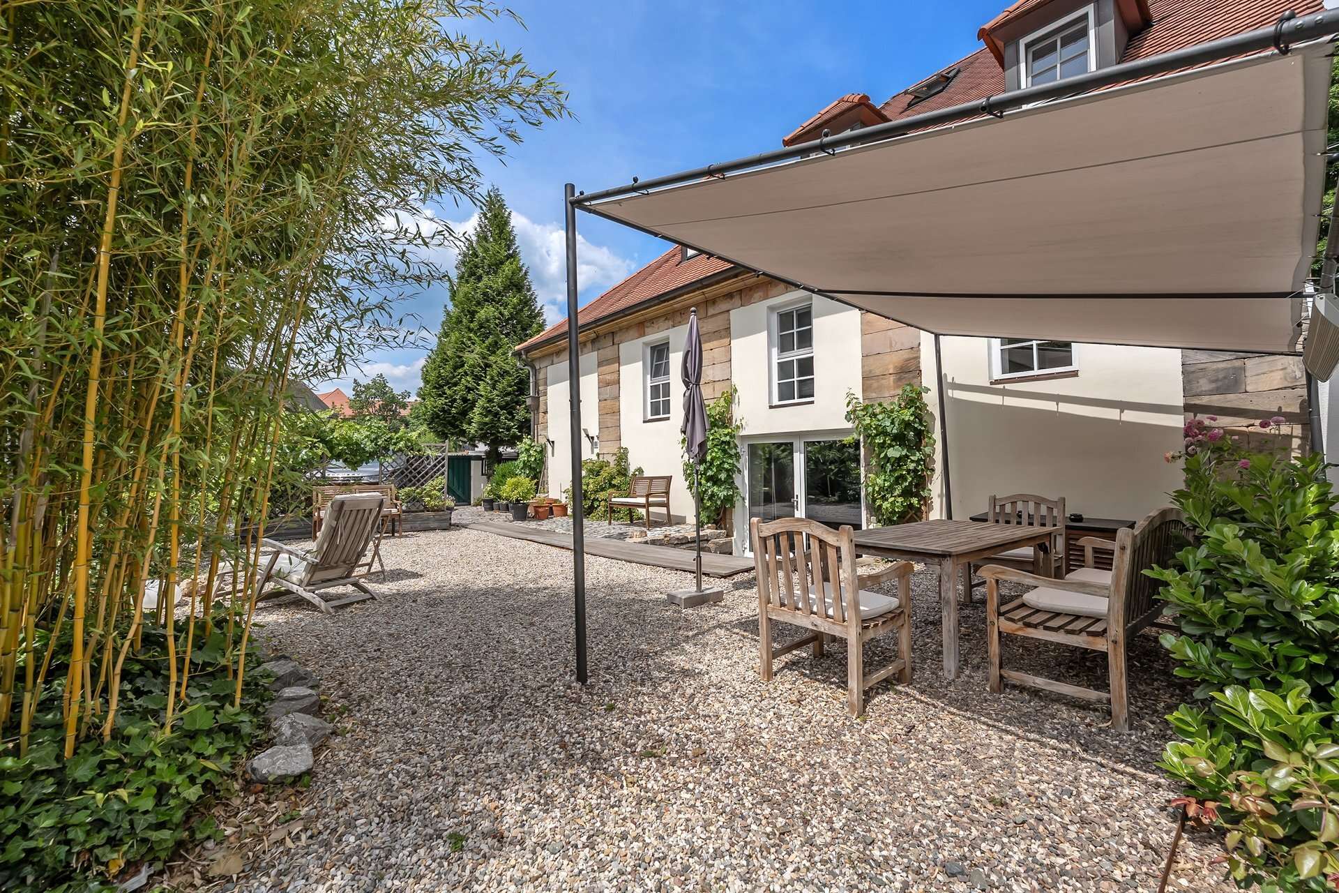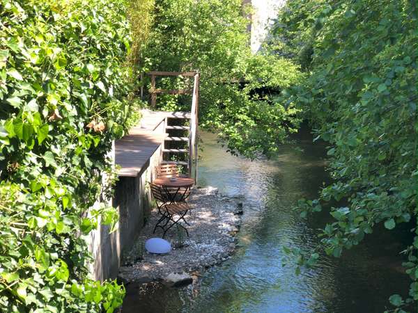 Das Erdgeschoss inklusive Galeriegeschoss (zusammen ca. 206,68 m²) wurde hochwertig zu modernen Büro- und Handelsflächen ausgebaut. Die hellen, offen gestalteten Räume bieten vielseitige Möglichkeiten – ob als Showroom, Praxis, kreative Gewerbeeinheit oder zur gewerblichen Kurzzeitvermietung. Die große Terrasse mit Gartenanteil hat einen direkten Zugang zum Mühlbach – ein echtes Highlight in dieser zentralen Lage.